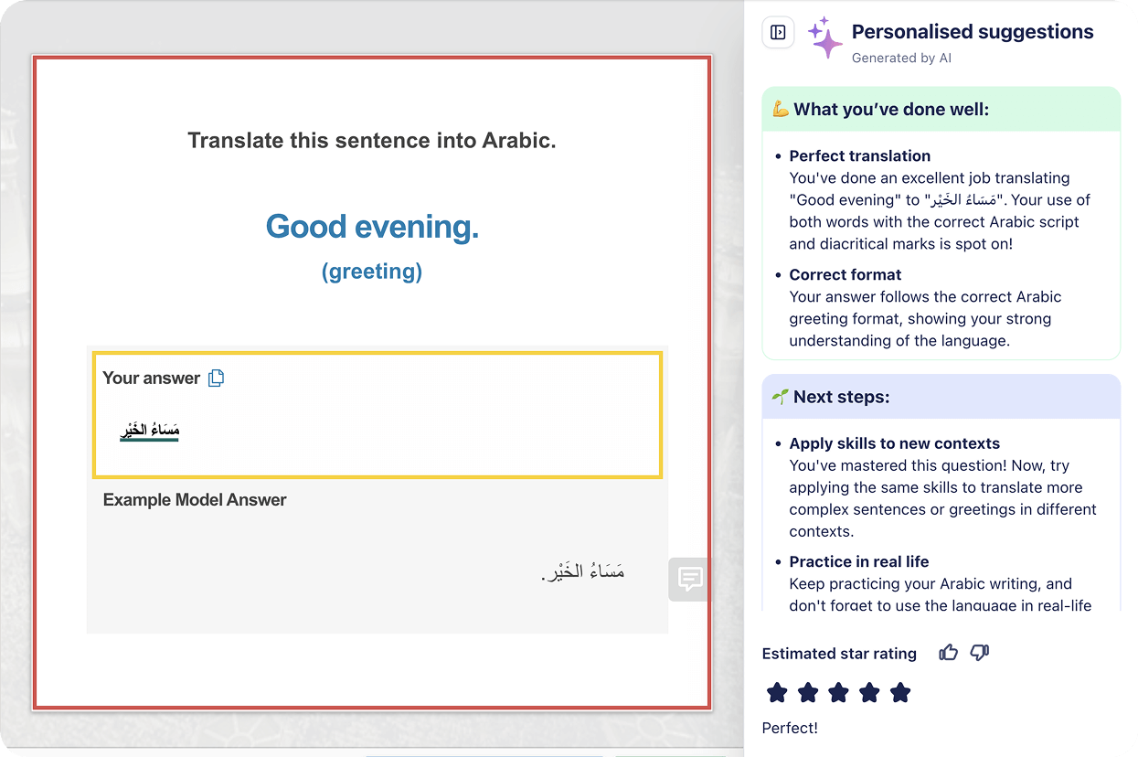 Our unique “Learning Loop” feature guides students to improve their answers based on AI feedback, which has shown to boost student engagement and understanding. Supporting seven languages, the tool broadens language-learning opportunities and is fully compliant with all current government AI guidelines, ensuring safe and secure interactions.