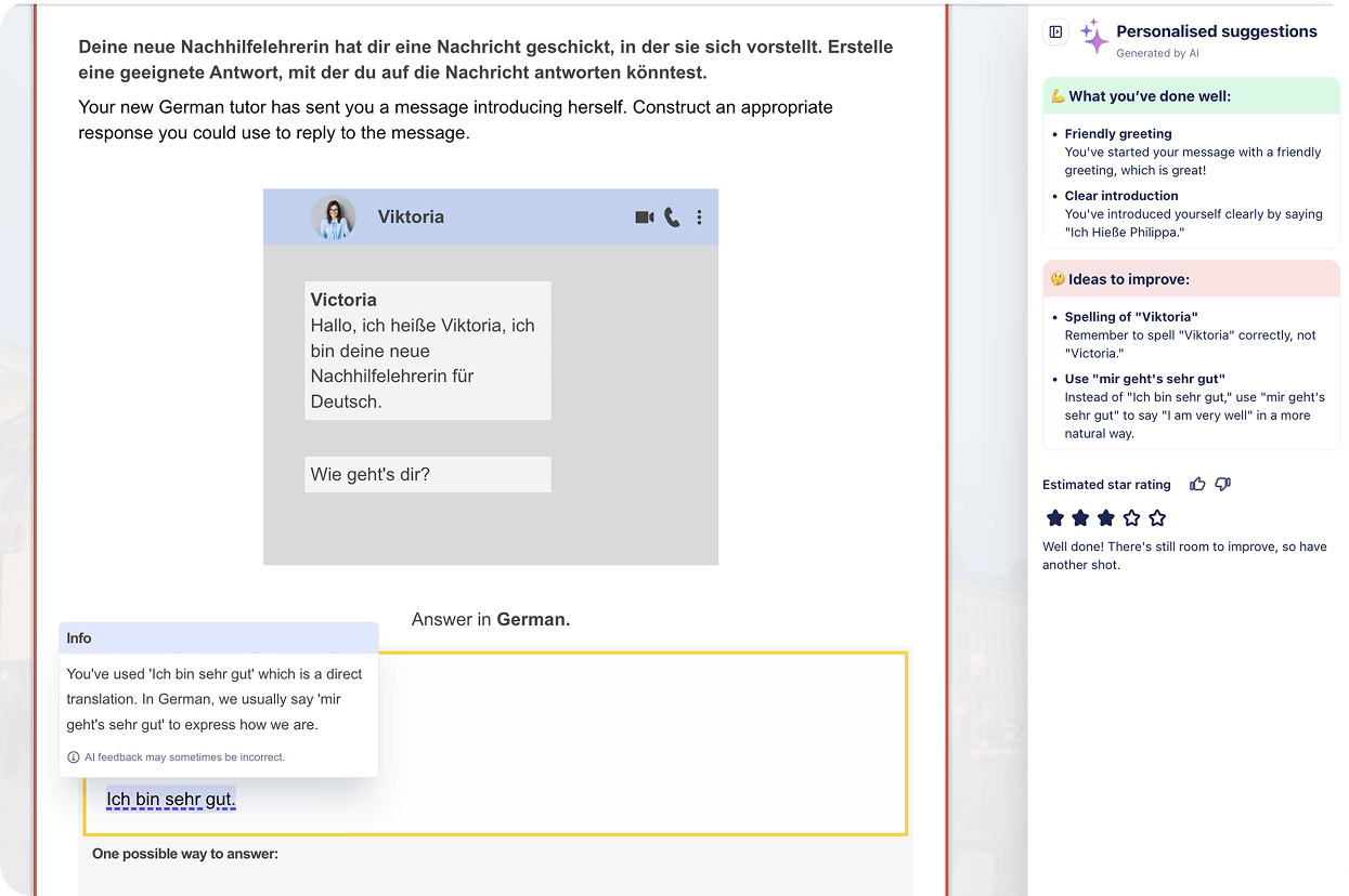 Our unique “Learning Loop” feature guides students to improve their answers based on AI feedback, which has shown to boost student engagement and understanding. Supporting seven languages, the tool broadens language-learning opportunities and is fully compliant with all current government AI guidelines, ensuring safe and secure interactions.