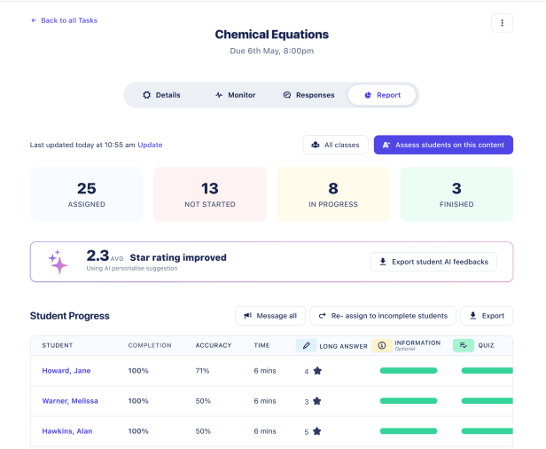 Keeping teachers central to learning is key to staying on track. Our Teacher Reporting provides clear visibility of student and AI responses, task completion and star ratings, helping teachers quickly identify student knowledge gaps.