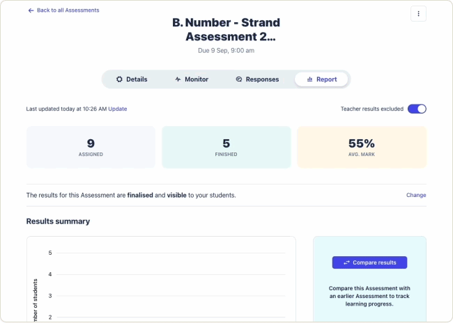 Our reporting features provide teachers with personalized insights by student, class and cohort against specific expectations.